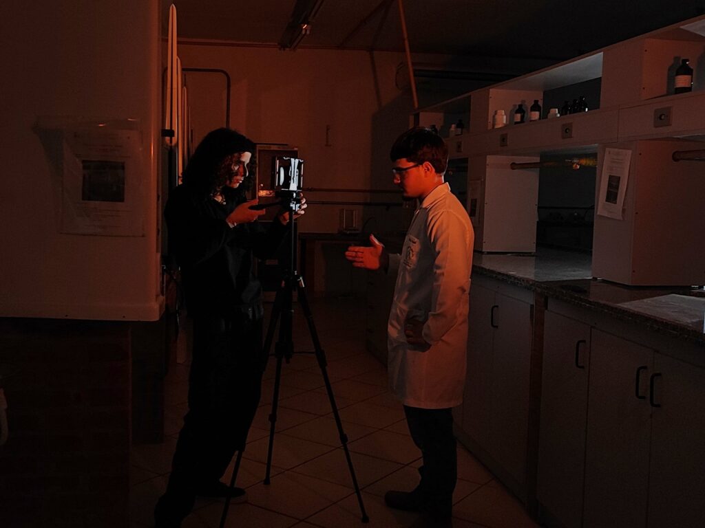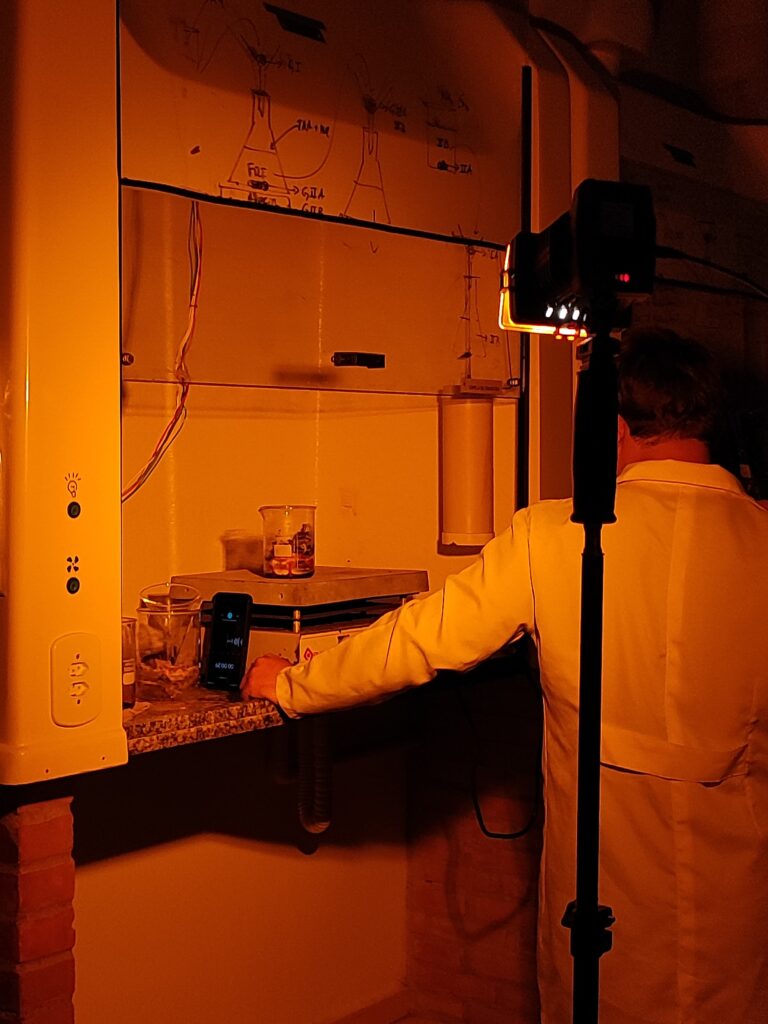 Então, chegamos na prática: a filmagem. Para isso, foram utilizadas duas tardes de quarta-feira. Na primeira, foram realizadas as gravações das cenas externas e a cena final; já na segunda, as cenas no Laboratório de Química do campus.